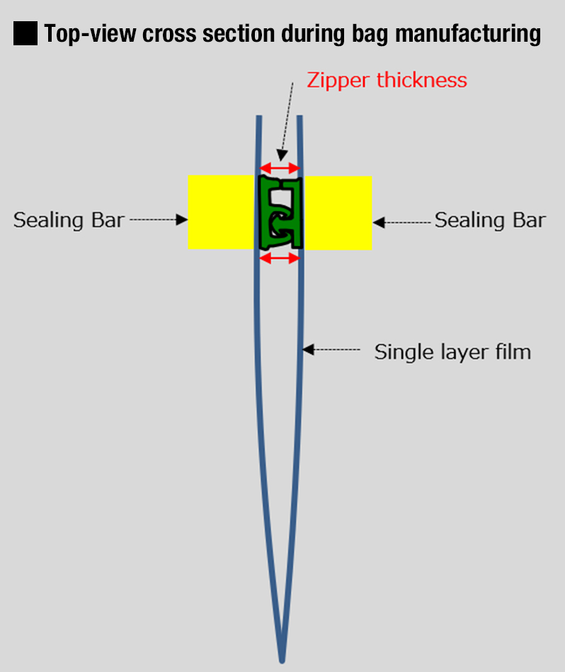 When producing pouches with a string zipper, the sealing process involves sandwiching <film><zipper><film> between the left and right sealing bars. Unlike sealing methods that apply pressure from top to bottom, thickness stability is especially critical in this process to achieve beautiful, high-quality pouch production.